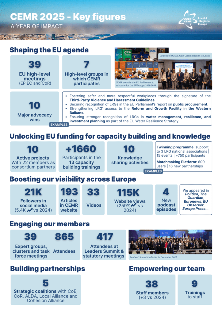 Les collectivités locales et régionales sont essentielles pour relever les défis les plus urgents et quotidiens de l’Europe, et grâce au CEMR, nous avons travaillé ensemble pour garantir que les voix locales européennes restent présentes, entendues et influentes dans les débats européens et mondiaux.