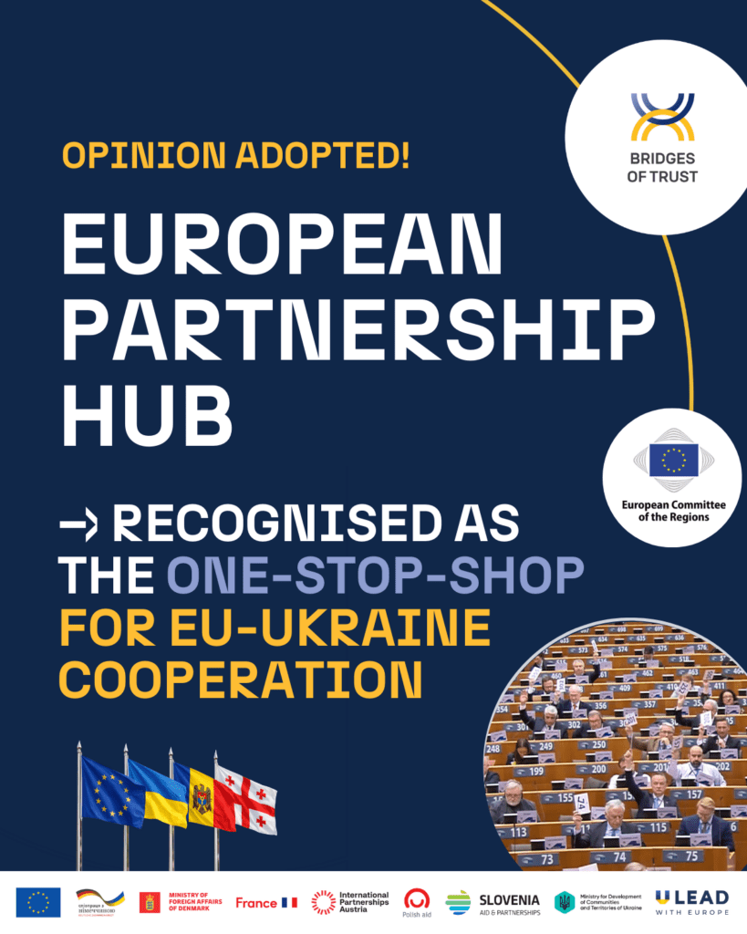 The European Committee of the Regions (CoR) has adopted an amendment explicitly recognising the European Partnership Hub (EPH) as the “one-stop-shop” for cooperation between local and regional governments in Ukraine and the EU. The Hub was launched at the 2025 Ukraine Recovery Conference, following the Joint Statement of the European Alliance of Cities and Regions for the Reconstruction of Ukraine.